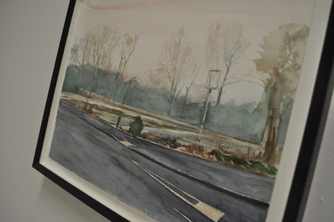 The watercolours were painted from photographs he took of the sites now: “Watercolour is usually a very British/ English medium that’s been used to represent a very pastoral vision of the countryside but I’ve used it here to depict a very non pastoral view of English life and I like that contradiction in a way.”