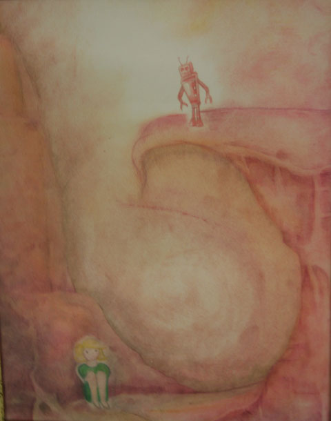 Katie O’s exhibition Minor Malfunctions, Psychology of the Machine, is on show at The Lock at the Canal Warehouse beside the Canal Basin. It tells the story of a young girl setting out through life, beset with worries and indecisions, feeling scared by the – in this work – scary monster looming over her, and then here getting some guidance from the friendly robot. Dreams seem out of reach, life is empty and she wonders if it will ever change.
