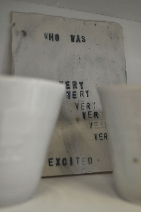 Sally Larke has created several cabinets each containing 33 pots, all slightly different, 33 being the age her brother would be if he hadn’t died tragically 10 years ago. The delicate works show the work of creating as being about contemplation of him and of her loss.
