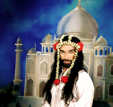In the photo Samson and Delilah the artist looks worried as actress Vanessa Ahmed caresses his lovely long hair, and in the two-screen film A Bride of Khusro he appears as a woman to perform Kathak Dance moves to a Qawali soundscape, in front of a Sufi shrine in Karachi.