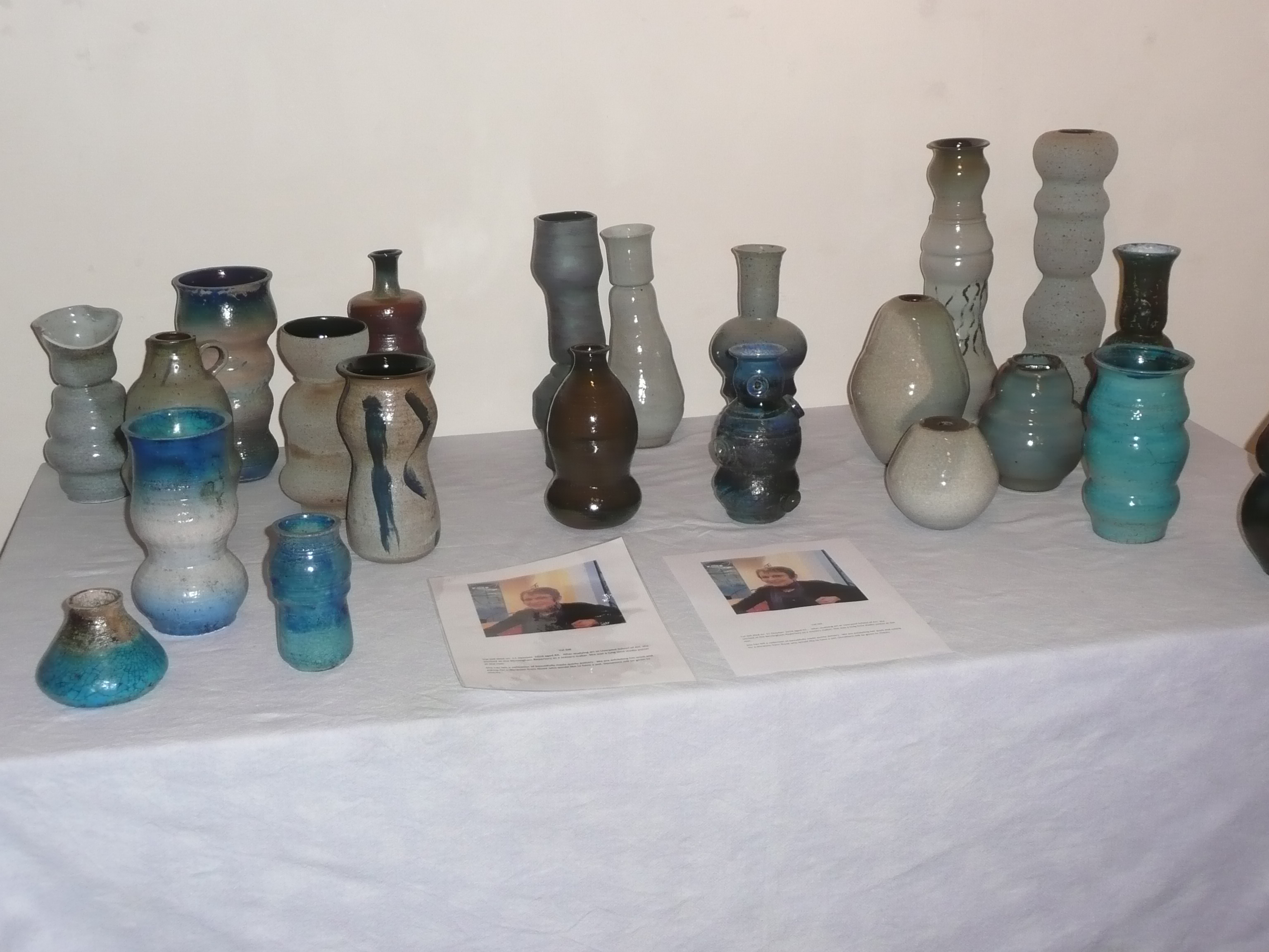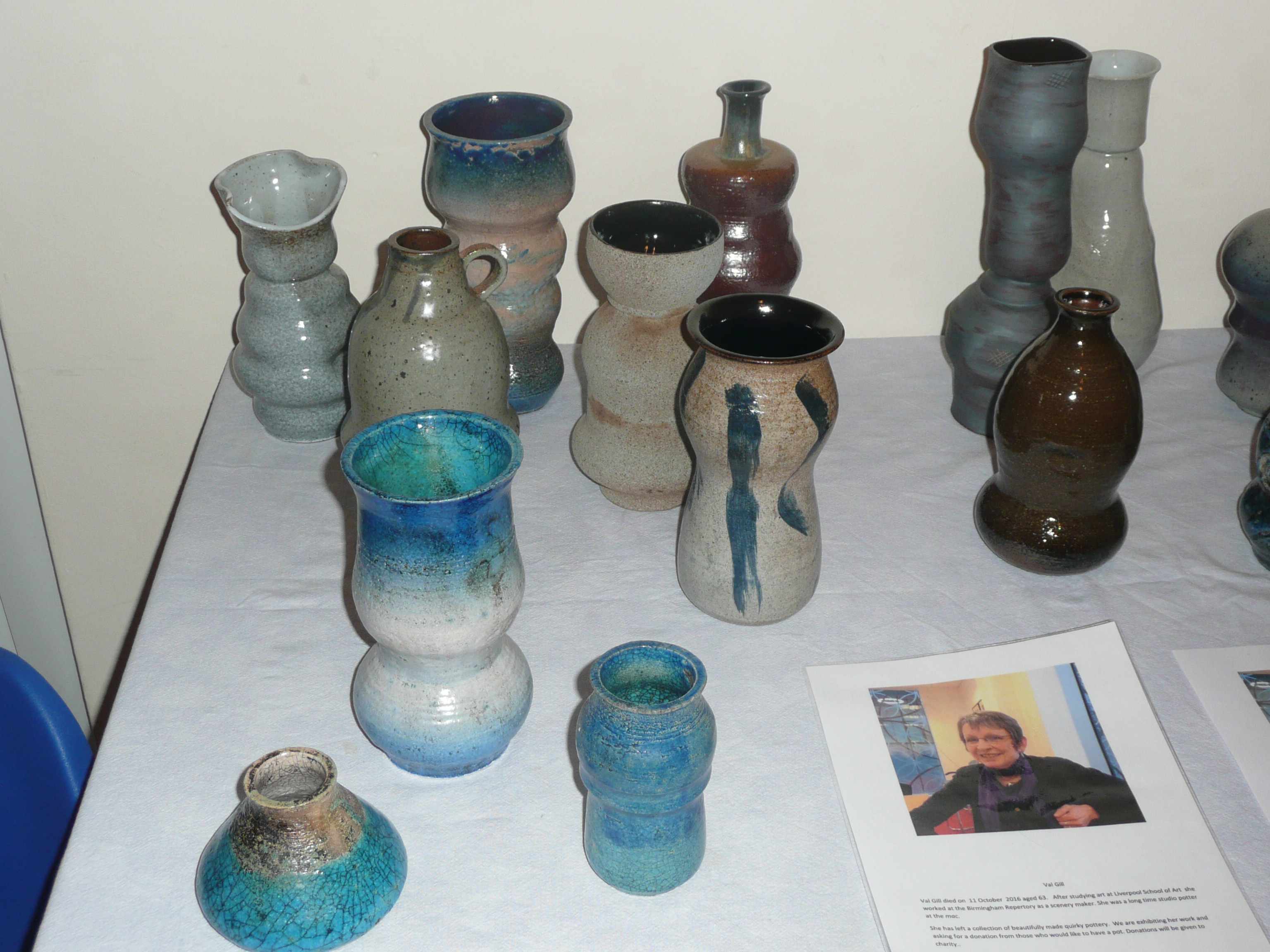 The works are in her very recognisable style, including some small, symmetrical raku works and others with a shiny glaze. There are also larger, typically asymmetrical, pieces, some of which look like different pots works merged together to create one. They are in a range of colours but nothing too dramatic, mostly blues and aqua, or sandy or grey earth colours. Some which look like vases are larger at the top than the bottom, and others have a Moorish look to them.