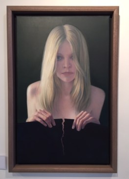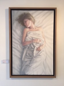 His celebrity collector, writer of screenplays, TV adaptations and novels Andrew Davies, who lives in Kenilworth, described Moore’s paintings in his opening speech as “tender, ruthless, sometimes downright disconcerting but always beautiful.” He said he owned half a dozen already but felt drawn towards another one in this exhibition – Disorientation, which appeared to show two attractive blonde women about to kiss – or is it one woman with a mirror image?