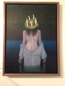 In Tenebrae a woman in a white robe sits in the coracle in water, a crown of candles on her head. Does it relate to a real story or myth? Neil is vague on the subject, just saying all his works are about people. In Baptism of Fire the same woman is in the water, her robe falling off and her head lowered, in what looks like some sort of sacrificial scene.