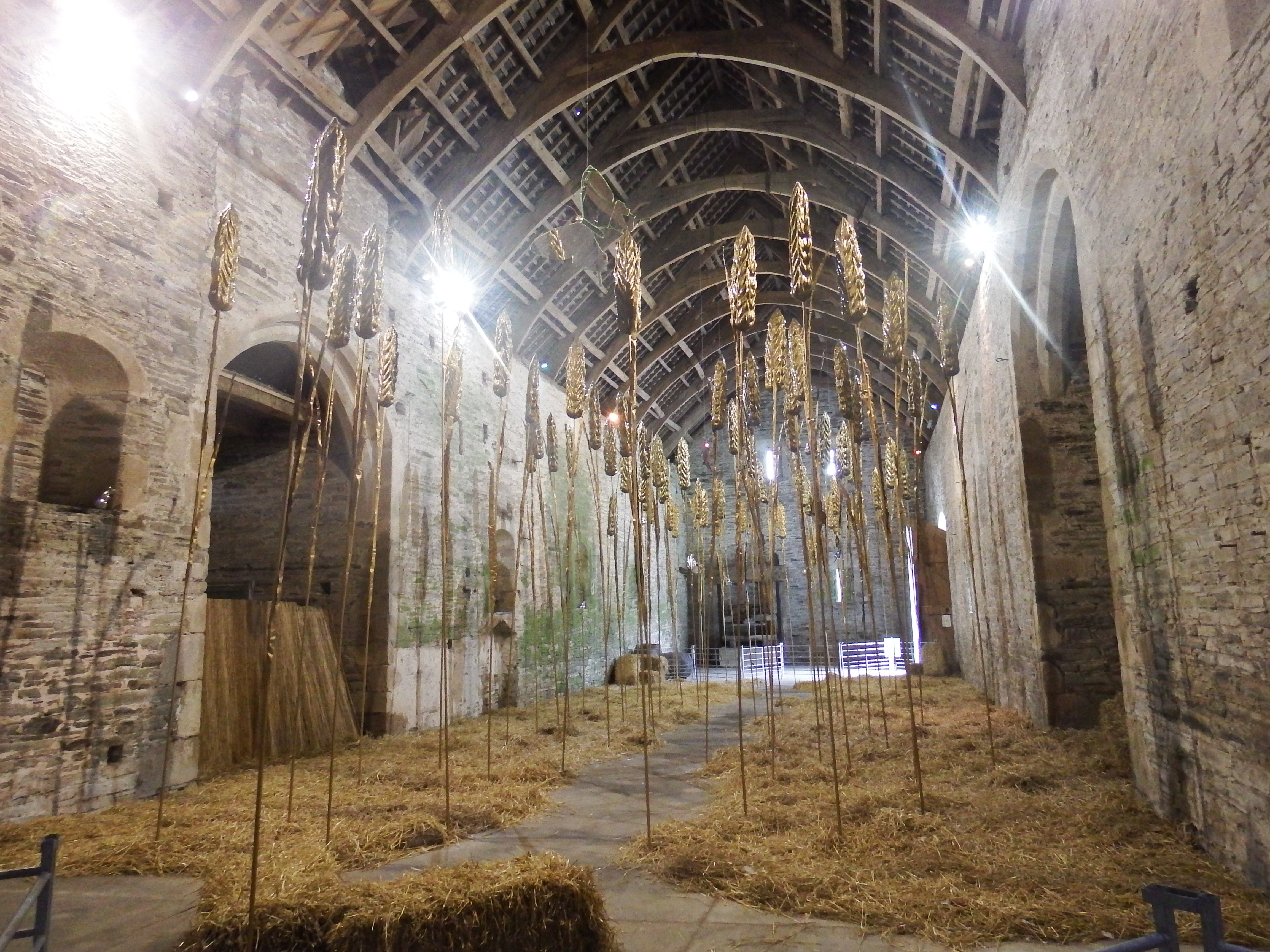 The Abbey’s impressive Great Barn (fittingly named) is filled with Goldfield, an old work on show for the first time in 41 years featuring huge golden sheaves, given lots of space amongst piles of straw in the ancient building.