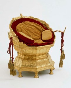 A textiles section includes a watercolour of various carpet designs, and some flower designs from 1905. There are nineteenth century clothes, beautifully embroidered, including one item with little figures and Muslim, Hindu and Sikh imagery combined, from 1835. Some items of furniture complete the exhibition, including wooden ones with inlaid ebony and ivory. The most dramatic exhibit is the Golden Throne made for the Ranjit Singh.