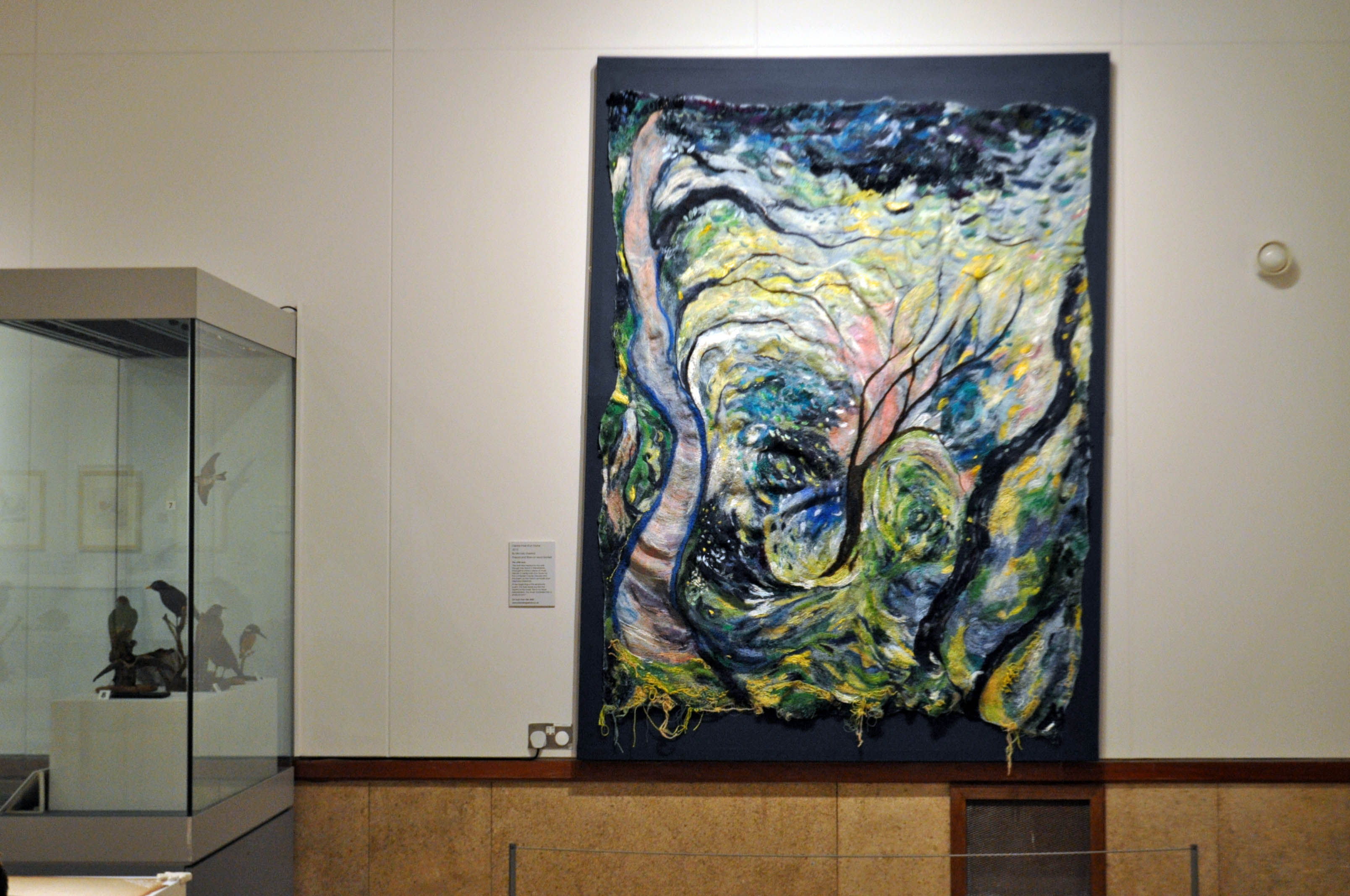 Warwickshire-based textile artist Michala Gyetvai’s large thread and fibre on wool blanket work L’après midi d’une faune work was inspired by a walk in Hay Wood in Warwickshire, and also music by Debussy and a poem by Stéphane Mallamé. It is a swirl of greens, yellows, blues and purples and looks like nature at the midst of a weather storm.